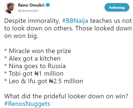 #BBNaija: Reno Omokri Stylishly Shades Cee-C After She Failed To Win BBN